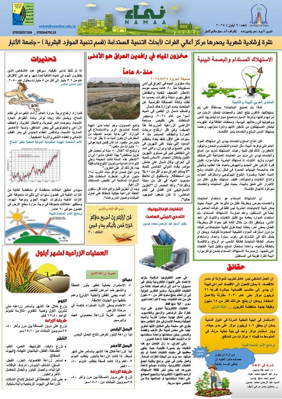 أصدر قسم تنمية الموارد البشرية في مركز أعالي الفرات لأبحاث التنمية المستدامة في جامعة الانبار، العدد التاسع للنشرة الإرشادية (نماء) لشهر ايلول/ سبتمبر 2025، وهي نشرة توعوية تعنى بمجالات التنمية المستدامة (البشرية والاجتماعية والاقتصادية والبيئية)، والتي تهدف إلى توعية وتطوير المعرفة واهميتها من خلال التفاعل بين مختلف الاختصاصات والطروحات للباحثين والمختصين في كافة النشاطات التي تصب في تحقيق أهداف التنمية المستدامة.