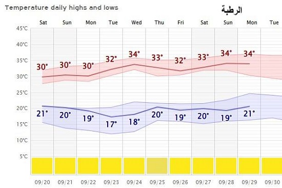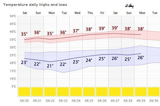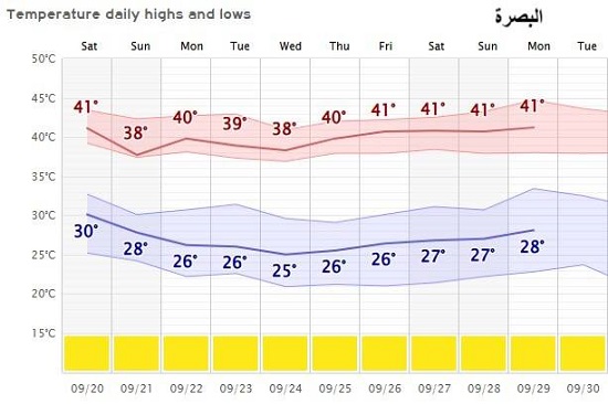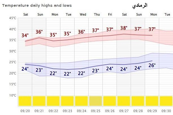 يتوقع بإذن الله تعالى ان سير درجات الحرارة للأيام العشر القادمة تكون معتدلة بشكل عام في البلاد، اذ قد يطرأ انخفاض تدريجي في الايام (20 – 25) ايلول ثم تعاود ارتفاع طفيف واستقرارها بعد ذلك، لا سيما مع بداية الانقلاب الخريفي يوم 22 ايلول، اذ يمثل حدث فلكي في كل عام وهو تبدأ الشمس بالابتعاد تدريجيا عن النصف الشمالي من الكرة الارضية آذناً لحلول فصل الشتاء ان شاء الله.